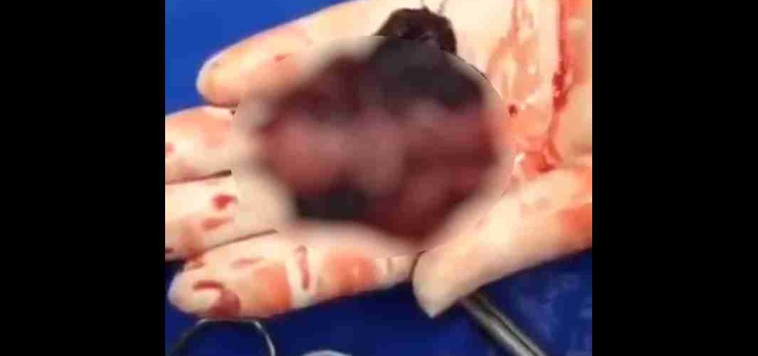 Nas imagens, a médica segura o feto ainda ligado à placenta. Ao fundo é possível ouvir uma voz feminina dizendo: “Ai gente, que dó. Ele está se mexendo”.