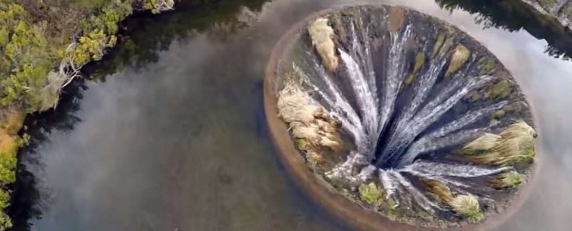 Construído em 1955, o sumidouro possui um cano de 4,6 m de altura e 48 de coroamento, além disso, o musgo que cresceu a sua volta lhe dá uma certa aparência natural (ou sobrenatural). Contudo, é sua semelhança com Caríbdis, monstro marinho que ficou conhecido na famosa Odisseia, de Homero, que chama mais atenção.