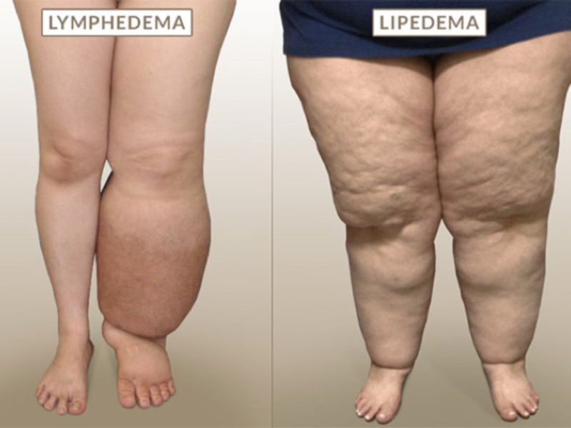 O linfedema ocorre pela obstrução dos canais linfáticos, o que leva a uma aparência assimétrica dos membros, podendo ocorrer em uma perna e não em outra, inclusive em mãos e pés, mas não de forma homogênea, o que não ocorre no caso de lipedema, que não está relacionado com obstrução dos vasos linfáticos.