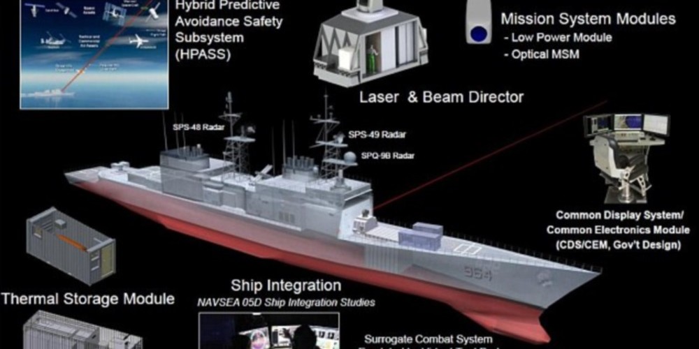 Em 2014, a Marinha dos Estados Unidos começou a usar um laser de 30 quilowatts a bordo do navio USS Ponce, durante as patrulhas do Golfo Pérsico. A arma pode endereçar ameaças múltiplas usando uma gama de opções, desde medidas não letais, como ofuscantes óticos, até destruição completa, se necessário. “As armas a laser são poderosas, acessíveis e desempenharão um papel vital no futuro das operações de combate naval“, disse o contra-almirante Matthew Klunder.