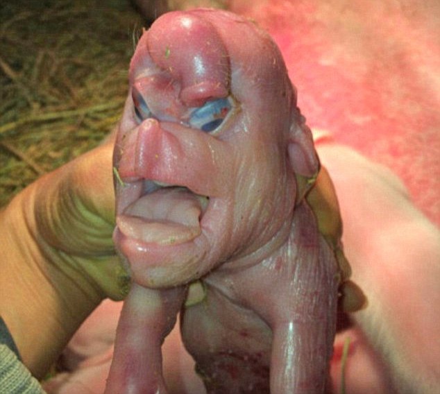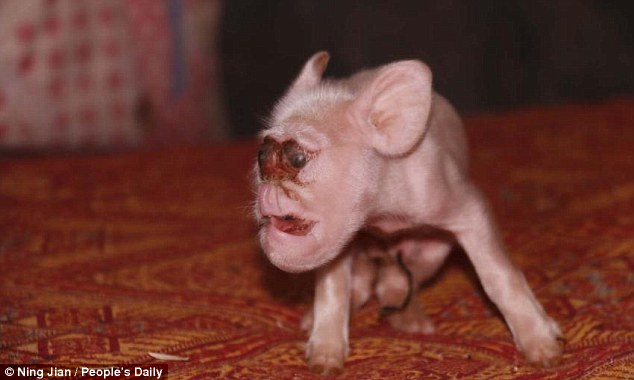 Enquanto isso, outro porco nasceu em uma zona rural do sudoeste da China com dois focinhos e três olhos. Já houve também o caso de um porco com aparência humana e outros com duas cabeças.